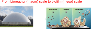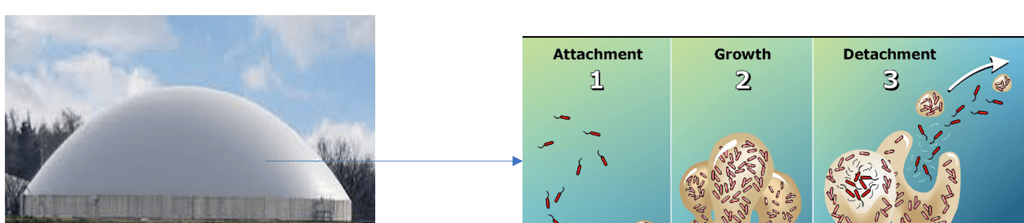 From Bioreactor to biofilm. What happens in bioreactor? When organic matters are introduced in wastewater treatment bioreactor, they are degradated by microorganisms called biofilms. These biofilms are communities of bacteria whose life can be described as follows: a normal lifecyle of a biofilm starts by attachment of small number of bacteria (phase 1), then they grow (phase 2), and they disperse (phase 3) because of washout or starvation.
