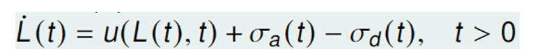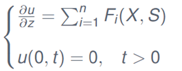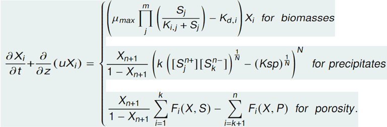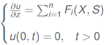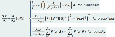 1) A system of hyperbolic PDEs modeling the growth of the biomass, the transport of the precipitation, and the change in the liquid phase of the biofilm (biofilm porosity).