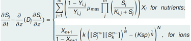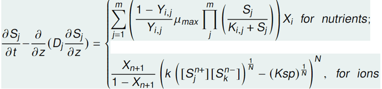 3) A system of parabolic PDEs for the substrates (nutrients) ions (anions and cations) diffusion in the biofilm.